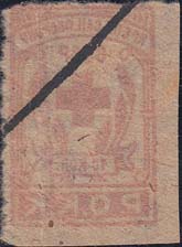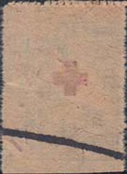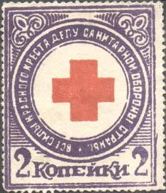 1930(?) г. Разм. рамки 36 х 43 мм. Двухцветная печать на белой бумаге. Зубц. 11 1/2. В двойной прямоугольной рамке с декоративными элементами в верхних углах вписана двойная круглая рамка. В центре круглой рамки красный крест. По периметру между круглыми рамками текст: «Все силы Красного Креста делу санитарной обороны страны». Внизу номинал.