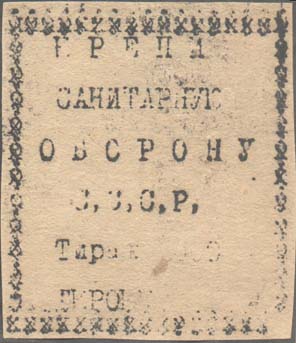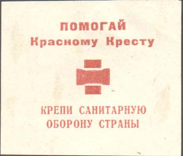 1930(?) г. Одноцветная и двухцветная печать на серой бумаге низкого качества. В рамке сверху текст: «Крепи сан[итарную]. Оборону СССР». В центре красный крест в обрамлении венка из колосьев пшеницы и номинал. Внизу буквы: «Р.О.К.К.».