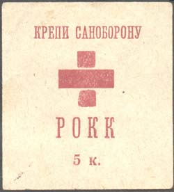 1930(?) г. Разм. 41 х 45 мм. Одноцветная печать на кремовой бумаге. В центре красный крест. Сверху текст: «Крепи саноборону». Внизу аббревиатура «РОКК» и номинал.