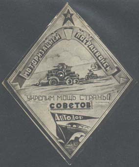 1930(?) г. Ромб разм. 46 х 56 мм. Одноцветная печать на белой глянцевой фотобумаге. В рамке ромбо-видной формы в центре броневик и мотоцикл. Сверху на ленте по внутреннему периметру рамки текст: «Моторизацией погранвойск». Ниже продолжение текста в две строки: «Укрепим мощь страны советов». В верхнем углу ромба пятиконечная звезда с серпом и молотом. Внизу плывущий катер с вымпелом, на котором текст: «Автодор».