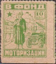 1930(?) г. Разм. рамки 24 х 30 мм. Одноцветная печать на белой бумаге. В прямоугольной рамке красноармеец с винтовкой и автомобиль на фоне индустриального пейзажа, самолеты и пятиконечная звезда. В правом верхнем углу номинал. Сверху текст: «В фонд». Внизу продолжение текста: «Моторизации».