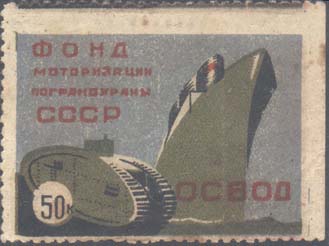 1930(?) г. Разм. по перфорации 54 х 40 мм. Многоцветная двухсторонняя печать на желтоватой бумаге. Нерегулярная зубц. На лицевой стороне в прямо-угольной рамке разм. 48 х 34 мм корабль и танк. В левом верхнем углу текст в четыре строки: «Фонд моторизации погранохраны СССР». В левом нижнем углу в круглой рамке номинал. В правом нижнем углу аббревиатура «ОСВОД». На оборотной стороне в прямоугольной рамке разм. 48 х 33 мм изображение корабля в рамке в форме пятиконечной звезды. Сверху текст в три строки: «Усилим мощь водного флота С.С.С.Р.».