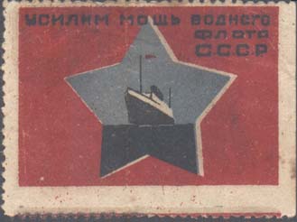 1932 г. Разм. рамки 39 х 53 мм. Двухцветная печать желтоватой бумаге. В центре текст в три строки: «Усилим мощь советского флота». Сверху эмблема ОСВОД и номинал. Внизу пароход «ОСВОД» на фоне гавани.