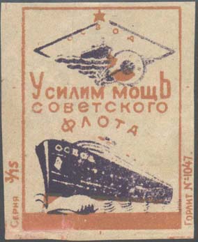 1932 г. Разм. рамки 38 х 54 мм. Двухцветная печать тонкой желтоватой бумаге. В центре текст в три строки: «Усилим мощь советского флота». Сверху эмблема ОСВОД. Внизу пароход «ОСВОД» в движении. Слева и справа вертикально выходные данные: «Серия 3/15. Горлит № 1047».