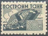 1930(?) г. Разм. рис. 22 х 15 мм. Одноцветная типографская печать на белой бумаге. Зубц. Лин. 10 1/2. С клеем. В центре изображение танка времен Первой мировой войны. Сверху текст: «Построим танк». На борту танка продолжение текста «ВОГОВЕЦ». В правом нижнем углу номинал.