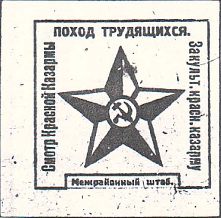 1925(?) г. Разм. 75 х 75 мм. Одноцветная печать на кремовой бумаге низкого качества. В центре в прямоугольной рамке разм. 61 х 58 мм пятиконечная звезда. По внутреннему периметру рамки текст: «Смотр Красной Казармы Поход трудящихся. За культ[урную]. Красн[ую]. Казарму. Межрайонный штаб».