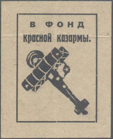 1925(?) г. Разм. рамки 47 х 62 мм. Одноцветная печать на серой бумаге. В прямоугольной рамке самолет, летящий влево вверх. Сверху текст в две строки: «В фонд красной казармы».