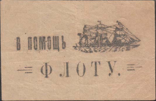 1925(?) г. Разм. 90 х 57 мм. Одноцветная печать на тонкой серой бумаге. В правом верхнем углу военный корабль. Слева и внизу текст в две строки: «В помощь флоту».
