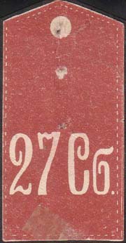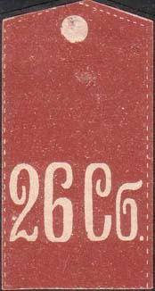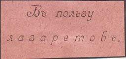 1915(?) г. Разм. 55 х 28 мм. Одноцветная печать на малиновой бумаге. В центре текст в две строки: «В пользу лазаретов».