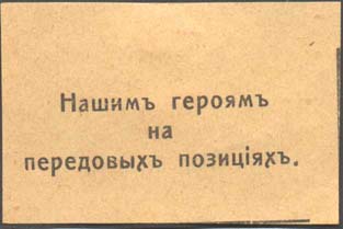 1915(?) г. Разм. 55 х 28 мм. Одноцветная печать на бумаге различных цветов. В центре текст в три строки: «Нашим героям на передовых позициях».