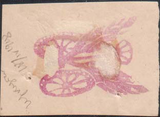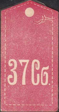 1918 г. 18.04.1918 г. Разм. 52 х 37 мм. Одноцветная двухсторонняя печать на белой бумаге. На лицевой стороне красно-фиолетовый оттиск ручного штампа с изображением автомобиля. На оборотной стороне розовый оттиск ручного штампа с эмблемой автомобильных частей. Сбор в пользу маршевых рот.
