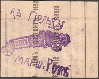 1918 г. 18.04.1918 г. Разм. 56 х 45 мм. Одноцветная печать на белой бумаге с текстом с двух сторон. На лицевой стороне синий оттиск ручного штампа с изображением автомобиля и текстом в две строки: «В пользу марш[евых]. рот». Сбор в пользу маршевых рот.