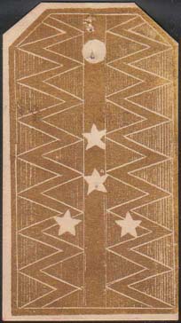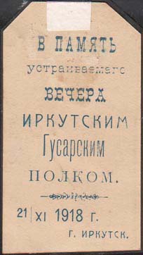 1918 г. 21.11.1918 г. Виньетка в виде погона разм. 34 х 60 мм. Двухцветная двухсторонняя печать на плотной белой бумаге. На лицевой стороне погон с четырьмя звездочками. На оборотной стороне текст в шесть строк: «В память устраиваемого вечера Иркутским Гусарским полком». Ниже декоративный элемент. Внизу текст в две строки: «21/IX 1918 г. Г. Иркутск».