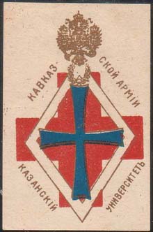 1914 г. Разм. 35 х 55 мм. Трехцветная печать на белой бумаге. В центре знак выпускника университета на фоне красного креста. Текст: «Казанский университет Кавказской армии».