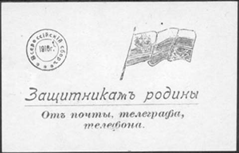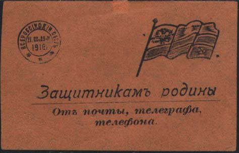 1916 г. Всероссийский сбор. Разм. 82 х 52 мм. Одноцветная печать на тонкой бумаге различных цветов. Сверху справа флаг Главного управления почт и телеграфов, слева в круге дата: «1916 г.». По окружности текст: «Всероссийский сбор». Внизу текст в три строки: «Защитникам Родины от почты, телеграфа, телефона».