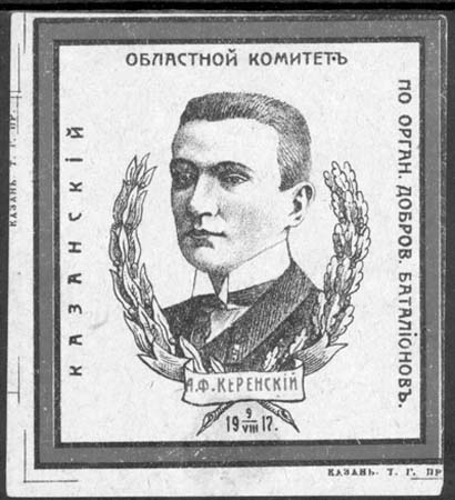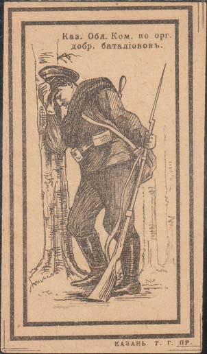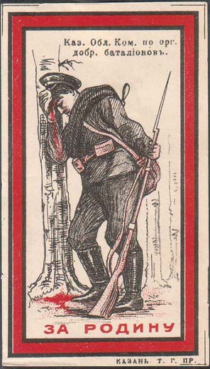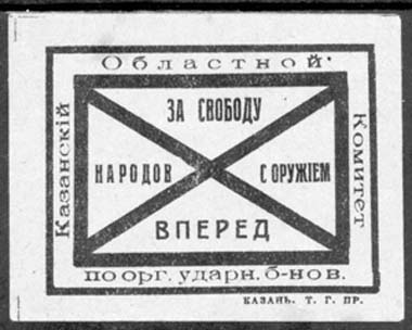 1917 г. Разм. рамки 46 х 32 мм. Одноцветная печать на красной бумаге. Рамка разделена диагональными полосами на четыре части. Текст: «За свободу народов с оружием вперед». Слева внизу под рамкой выходные данные мелким шрифтом: «Казань Т.Г.Пр.».