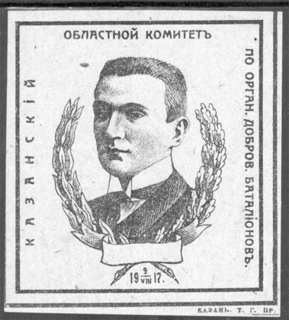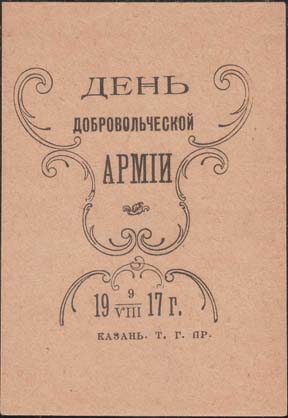 1917 г. 09.08.1917 г. Рзм. 48 х 64 мм. Одноцветная печать на бумаге различных цветов. Сверху текст в три строки: «День Добровольческой Армии». Внизу дата: «9/VIII 1917 г.» и выходные данные: «Казань. т. г. пр.».