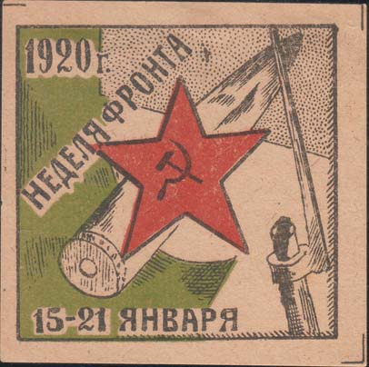 1920 г. 15.21.01.1920 г. Разм. рамки 57 х 57 мм. Трехцветная печать на толстой кремовой бумаге. В рамке в центре пятиконечная звезда и винтовочный патрон. Справа внизу часть ствола винтовки со штыком. В левом верхнем углу дата: «1920». Ниже по диагонали слева направо текст: «Неделя фронта». Внизу дата: «15-21 января».