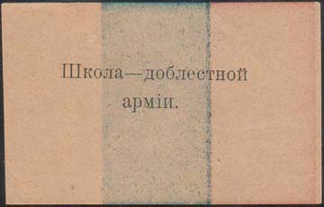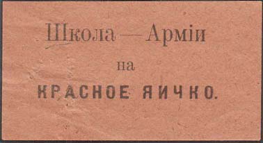 1915(?) г. Разм. 63 х 33 мм. Одноцветная печать на серо-коричневой бумаге. В центре текст в три строки: «Школа – Армии на красное яичко».