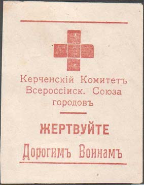 1915 г. Разм. 38 х 54 мм. Одноцветная печать на белой бумаге. Сверху красный крест. В центре текст в три строки: «Керченский Комитет Всероссийск[ого]. Союза городов». Ниже текст: «Жертвуйте Дорогим Воинам».