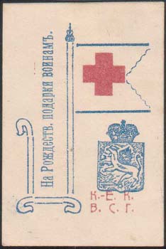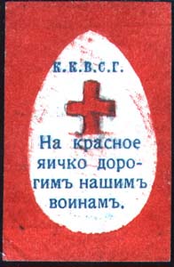 1915(?) г. Разм. 31 х 49 мм. Двухцветная печать на белой бумаге. В центре пасхальное яйцо. На яйце сверху аббревиатура «К.К.В.С.Г.» и красный крест. Внизу текст в четыре строки: «На красное яичко дорогим нашим воинам».