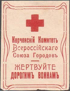 1916 г. Разм. 39 х 52 мм. Одноцветная печать на желтоватой бумаге. В двойной декоративной рамке сверху красный крест. В центре текст в три строки: «Керченский Комитет Всероссийского Союза Городов». Ниже текст в две строки: «Жертвуйте Дорогим Воинам».