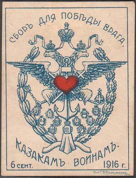 1916 г. 06.09.1916 г. Разм. рамки 42 х 55,5 мм. Двухцветная печать на кремовой бумаге. В центре знак общества. Сверху текст в две строки: «Сбор для победы врага». Внизу полукругом текст в две строки: «Казакам воинам 6 сент[ября]. 1916 г.». Справа внизу под рамкой мелким шрифтом выходные данные: «Лит. С.В.Кульженко».