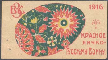 1916 г. Разм. 57 х 32 мм. Трехцветная печать на сероватой плотной бумаге. Серия виньеток с одинаковым рисунком: пасхальное яйцо с различным орнаментом. Сверху слева буквы «ВЗС», справа дата: «1916». Справа внизу текст в три строки: «Красное яичко – Русскому Воину».