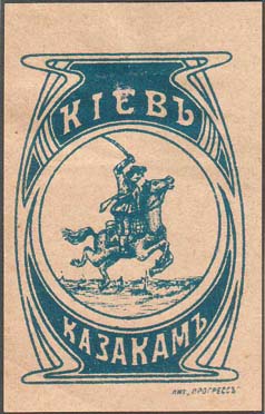 1915(?) г. Разм. 39 х 56 мм. Одноцветная печать на желтоватой бумаге. В центре в декоративной рамке казак с шашкой наголо, скачущий на лошади. Текст: «Киев казакам». Внизу выходные данные мелким шрифтом: «Лит. Прогресс».