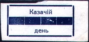 1915(?) г. Разм. 50 х 22 мм. Одноцветная печать на белой бумаге. В прямоугольной рамке разм. 38 х 18 мм в центре широкая горизонтальная полоса и текст в две строки: «Казачий день».