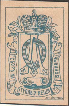 1915(?) г. Разм. рамки 33 х 51 мм. Одноцветная печать на белой бумаге. В центре щиток с вензелями: «О» и «А». Сверху корона. Внизу на ленте текст: «Сбор на теплые вещи воинам». Справа внизу выходные данные мелким шрифтом: «Лит. Прогресс».