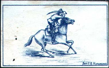 1916 г. 31.08.1916 г. Разм. рамки 61 х 36 мм. Одноцветная печать на белой бумаге. В рамке казак, скачущий на лошади с шашкой на замахе. Внизу слева мелким шрифтом выходные данные: «Лит. С.В. Кульженко».