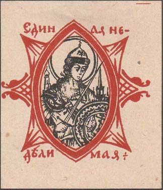 1919 г. Разм. 55 х 63 мм. Двухцветная печать на тонкой сероватой бумаге. В центре в декоративной рамке сложной формы женщина, символизирующая Россию в доспехах с мечом и щитом на фоне московского Кремля. Текст в две строки шрифтом стилизованным под славянскую вязь: «Единая не-делимая».