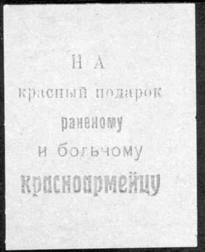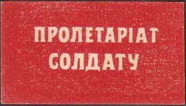 1917 г. Разм. 46 х 26 мм. Одноцветная печать на белой бумаге. Текст в две строки: «Пролетариат солдату».