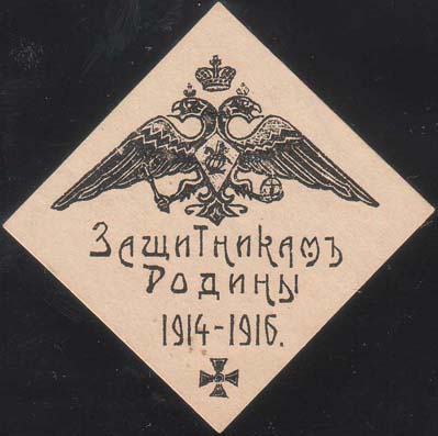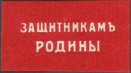 1917 г. Разм. 47 х 28 мм. Одноцветная печать на белой бумаге. Текст в две строки: «Защитникам Родины».