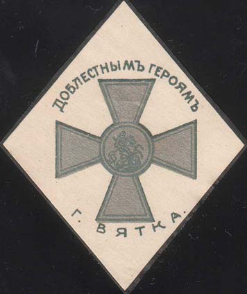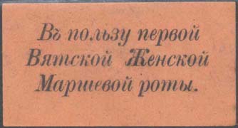 1917(?) г. Разм. 55 х 29 мм. Одноцветная печать на оранжево-красной бумаге. В центре текст в три строки: «В пользу первой Вятской Женской Маршевой роты».