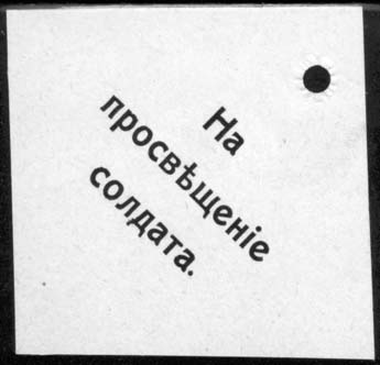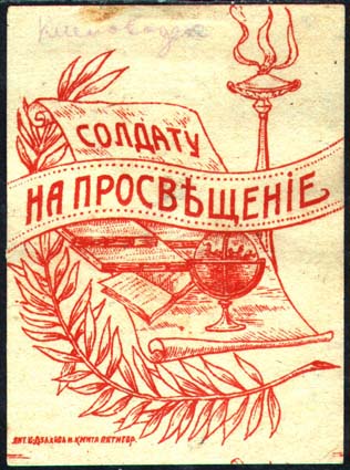 1915(?) г. Разм. 51 х 70 мм. Одноцветная печать на желтоватой бумаге. В центре книги, глобус, лавровая ветвь и светильник. На ленте текст: «Солдату на просвещение». Слева внизу мелким шрифтом выходные данные: «Лит. Дзакова и Кмата Пятигор.».