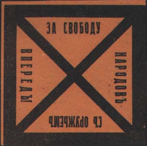 1917 г. 05.-06.10.1917 г. Разм. 49 х 49 мм. Одноцветная печать на бу-маге различных цветов. По периметру знака толстая прямоугольная рамка, поле разделено толстыми диагональными линиями на четыре части. По периметру внутри рамки текст: «За свободу народов с оружием вперед!».