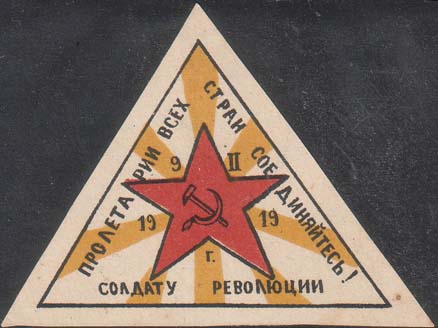1919 г. 09.02.1919 г. Виньетка в форме треугольника разм. рамки 61 х 45 мм. Трехцветная печать на белой бумаге. В центре красная звезда с серпом и молотом. Между лучами звезды дата: «9.II.1919 г». По периметру рамки текст: «Пролетарии всех стран соединяйтесь! Солдату революции».
