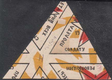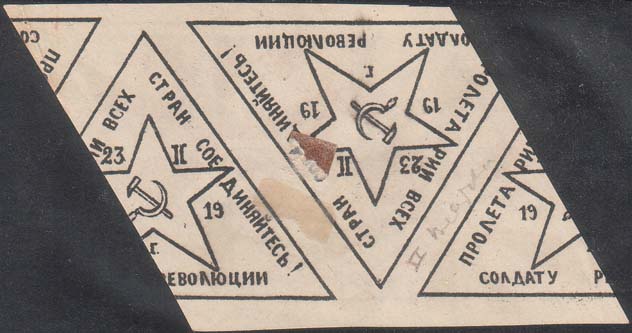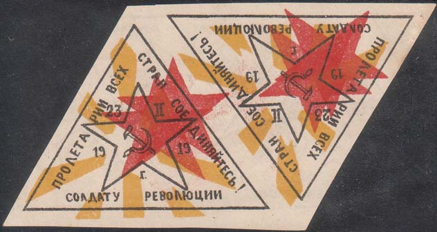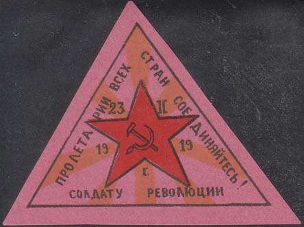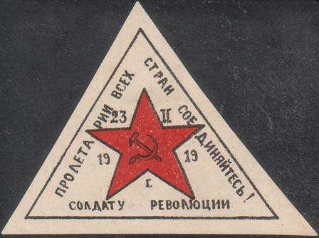1919 г. 23.02.1919 г. Виньетка в форме треугольника разм. рамки 61 х 45 мм. Трехцветная печать на бумаге различных цветов. В центре красная звезда с серпом и молотом. Между лучами звезды дата: «23.II.1919 г». По периметру рамки текст: «Пролетарии всех стран соединяйтесь! Солдату революции».