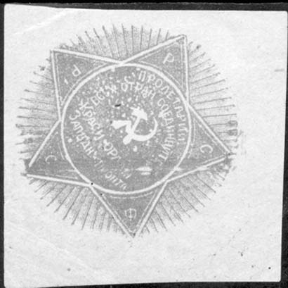 1920(?) г. Разм. 65 х 65 мм. Одноцветная печать на желтоватой бумаге. В центре пятиконечная звезда, на лучах которой буквы: «Р.С.Ф.С.Р.». В центре в круге серп и молот и текст: «Пролетарии всех стран соединяйтесь. Красн[ым]. орлам Западн[ого] фронта».