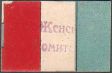 1915(?) г. Разм. 36 х 25 мм. Трехцветная печать на белой бумаге. Виньетки в виде флагов стран-союзниц России в первой мировой войне. Фиолетовая горизонтальная надпечатка каучуковым штампом в две строки: «Женский комитет».