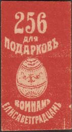 1915(?) г. Разм. 24 х 43 мм. Одноцветная печать на плотной желтоватой бумаге. В центре пасхальное яйцо. Сверху текст в три строки: «256 для подарков». Внизу продолжение текста в две строки: «Воинам Елисаветградцам».