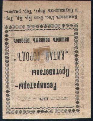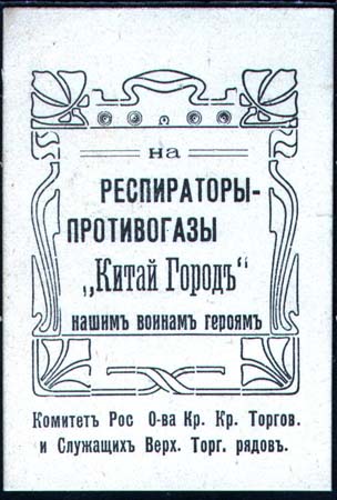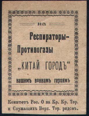 1915 г. 23.-26.06.1915 г. Разм. 50 х 73 мм. Одноцветная печать на толстой желто-серой бумаге. В центре в декоративной рамке разм. 40 х 50 мм текст в пять строк: «На респираторы-противогазы «Китай Город нашим воинам героям»». Внизу под рамкой текст в две строки: «Комитет Рос[сийского]. О-ва Кр[асного]. Кр[еста]. Торгов[цев]. и Служащих Верх[них]. Торг[овых]. Рядов».