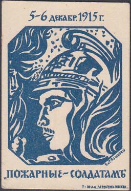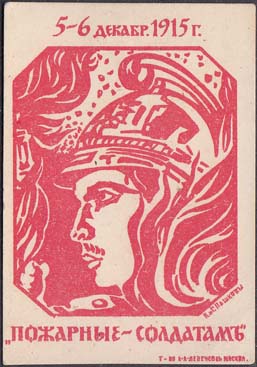 1915 г. 05.-06.12.1915 г. Разм. 43 х 63 мм. Одноцветная печать на плотной белой бумаге. В восьмиугольной рамке голова пожарного в каске на фоне языков пламени. Сверху дата: «5-6 декабря 1915 г.». Внизу текст в одну строку: «Пожарные - солдатам». Слева под рамкой мелким шрифтом инициалы художников: «Н. и Г. Пашковы». Ниже выходные данные: «Т-во А. А. Левинзон Москва».