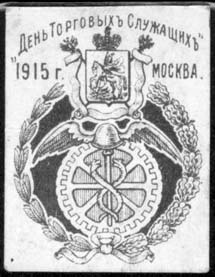 1915 г. Разм. 35 х 47 мм. Одноцветная печать на толстой сероватой бумаге. В центре эмблема об-щества. Сверху герб Москвы. Текст: ««День торговых служащих» 1915 г. Москва».