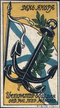 1916 г. 01.-03.03.1916 г. Разм. рамки 31 х 59 мм. Трехцветная печать на сероватой бумаге. В центре военно-морской флаг России, якорь с четырьмя лапами и оливковая ветвь. Сверху текст: «День якоря». Внизу текст в две строки: «Император[ское]. общ[ество]. для сод[ействия]. рус[скому]. тор[говому]. мореход[ству].».