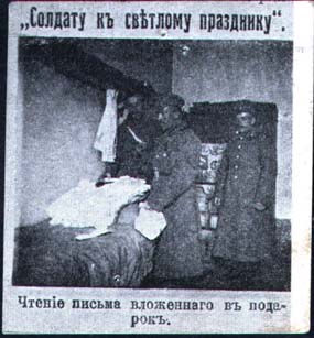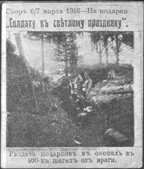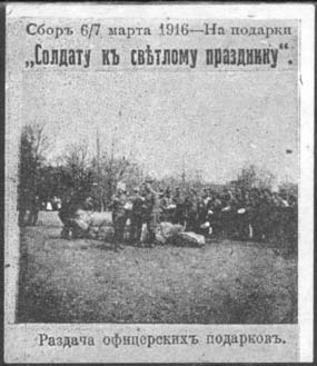 Раздача подарков солдатам в окопах. Внизу текст в две строки: «Раздача подарков в окопах в 400-х шагах от врага».