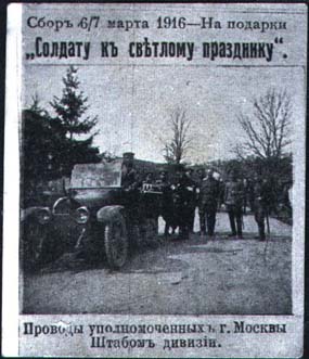 Автомобиль и группа офицеров. Текст под ри-сунком: «Проводы уполномоченных г. Москвы Штабом дивизии».
