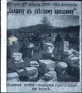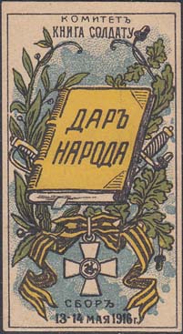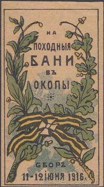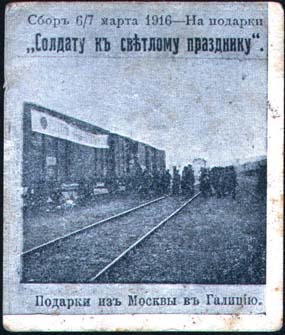 1916 г. 06.-07.03.1916 г. Разм. 48 х 55 мм. Двухцветная печать на толстой белой бумаге. Различные рисунки. Текст сверху: «Сбор 6/7 марта 1916 - на подарки «Солдату к светлому празднику»». Внизу под рисунком пояснительные тексты.